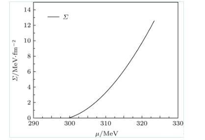 利用薄壁近似,圖2給出了當T=Tc時,夸克強子一級相變的表面張力隨夸克化學勢的變化。可知在一級相變區域,當化學勢增大時,強子相的表面張力也隨著化學勢增大。當溫度接近零時,強子夸克相變的表面張力約為12.6 MeV/fm2.在T→0的情況,本文理論預言與文獻一致,但該文獻只是考慮T=0的冷夸克物質的夸克強子一級相變。