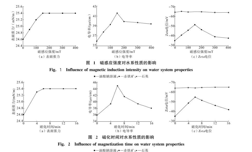 (2)表面張力、電導(dǎo)率和Zeta電位測試結(jié)果表明,磁化處理后溶液中油酸鈉離子濃度增加,油酸根離子在赤鐵礦表面的吸附增強(qiáng),有利于赤鐵礦和石英的浮選分離。