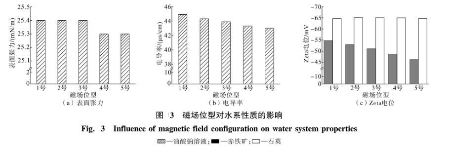 由圖3可知,1號磁場位型條件下,油酸鈉的表面張力、電導(dǎo)率和赤鐵礦的Zeta電位絕對值均最大。