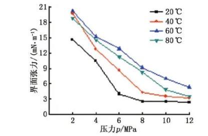 圖6不同溫度下壓力對平衡界面張力的影響