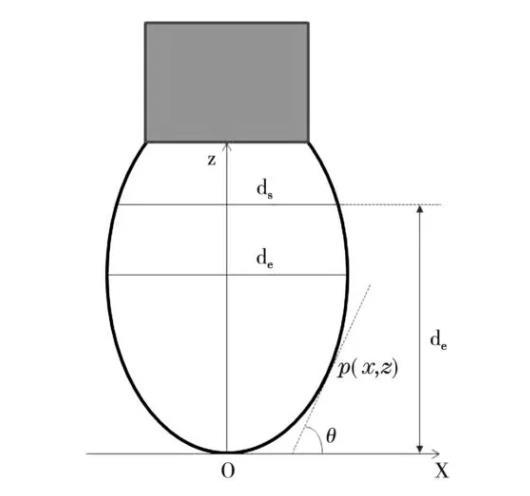 對于圖1所示的液體懸滴,以懸滴頂點O為坐標原點,該點處的水平切線為x軸,懸滴輪廓的對稱軸為z軸,建立平面直角坐標系。設懸滴輪廓上任意一點p的坐標為(x,z),p點處切線與x軸的夾角為θ。