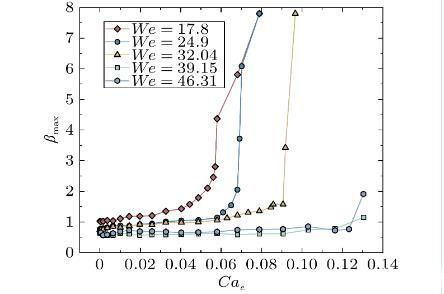 圖6描述了不同韋伯數下液滴最大無量綱拉伸系數βmax的對比趨勢。最大拉伸系數值是在式(5)的基礎上求取:βmax=Hmax/D0,其中Hmax為液滴在撞擊過程中達到的最大拉伸高度??梢园l現,當實驗條件設定為低韋伯數和高電毛細數時,液滴的最大拉伸系數明顯增大,甚至在此條件下部分液滴產生了射流模態,所形成的液絲長度超出了上極板的界限。除此之外,前三組韋伯數下的液滴撞擊實驗結果分析,得到結論:韋伯數的增大,直接導致液滴達到噴射狀態所需的電毛細數相對應增大。