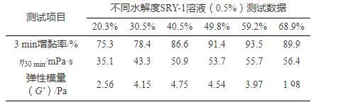 采用提純的聚合物,參照GB 12005.6—89《部分水解聚丙烯酰胺水解度測定方法》進行水解度的測定。室內進行了水解度控制單體比例為20%、30%、40%、50%、60%、70%的一系列聚合實驗,制得不同水解度的SRY-1樣品,參照GB 12005.6—89《部分水解聚丙烯酰胺水解度測定方法》測試水解度分別為20.3%、30.5%、40.5%、49.8%、59.2%、68.9%。分別配制0.5%SRY-1溶液,測試3 min、30 min表觀黏度,并進一步進行了定頻率定應力黏彈性掃描實驗(測試條件f=1 Hz、τ=0.5 Pa、t=5 min)和降阻性能測試實驗(Q=45 L/min),測試結果見表2。