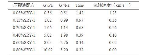 測試表明:隨SRY-1濃度的增加,壓裂液彈性模量G′不斷增大,Tanδ不斷減小,并且SRY-1超過CAC1(0.18%)后,增大和減小的趨勢更明顯。從壓裂液微觀作用機理分析,優(yōu)良的黏彈特性建立在CAC之上,依靠分子鏈間多重共價鍵交聯(lián)作用來形成高強度空間網(wǎng)絡(luò)結(jié)構(gòu),才能在壓裂液懸浮、攜帶支撐劑能力上發(fā)揮獨特優(yōu)勢。為此,進一步測試了40/70支撐劑在壓裂液中的沉降速度,結(jié)合壓裂液G′、G″、Tanδ與沉降速度進行關(guān)聯(lián)分析,如表5所示。
