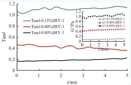 黏彈性是指流體對施加外力的響應(yīng),表現(xiàn)為黏性和彈性雙重特性,通常用G′表征彈性模量,G″表征黏性模量,而G″與G′的比值記作Tanδ,用于表征流體黏彈性的強弱:隨Tanδ由大到小變化,流體黏彈特性越明顯,Tanδ>1時,流體流動性強,Tanδ<1時,流體結(jié)構(gòu)性強。對0.15%、0.4%、0.8%SRY-1的壓裂液進行了黏彈性測試(利用RS6000流變儀錐板測試系統(tǒng)進行定頻率定應(yīng)力掃描實驗,測試得到的彈性模量G′、Tanδ變化情況見圖6所示。