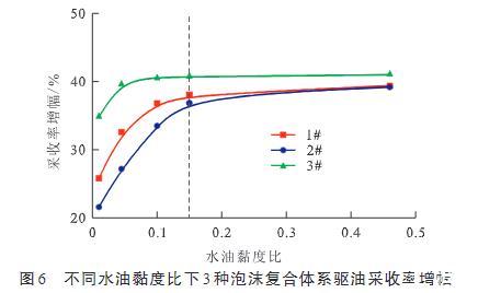 圖6不同水油黏度比下3種泡沫復(fù)合體系驅(qū)油采收率增幅