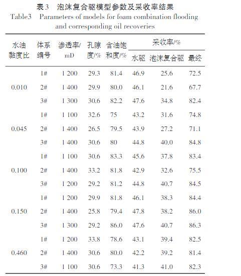 隨著水油黏度比的增大,3種泡沫復(fù)合體系采收率增幅的差異逐漸減小,水油黏度比界限為0.150:①當(dāng)水油黏度比小于該界限,分別為0.010,0.045和0.100時(shí),1#超低界面張力泡沫復(fù)合體系驅(qū)油采收率增幅分別為25.6%,31.6%和37.8%;2#乳化泡沫復(fù)合體系驅(qū)油采收率增幅分別為21.6%,27.2%和32.6%,較1#采收率增幅低,1#超低界面張力泡沫復(fù)合體系驅(qū)油效果強(qiáng)于2#乳化泡沫復(fù)合體系,后者不能替代前者;3#雙效泡沫復(fù)合體系驅(qū)油采收率增幅分別為34.8%,40.0%和40.7%,較1#高9.2%,8.4%,2.9%;可見(jiàn),在超低界面張力基礎(chǔ)上增強(qiáng)體系乳化性能,能夠明顯改善驅(qū)油效果。
