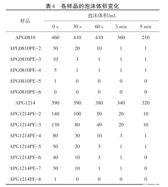 泡沫是氣體在液體中的分散體系,氣體成為氣泡被連續相的液體分隔開,氣體是分散相,液體是分散介質。在大規模的洗滌和印染工業中,泡沫給操作帶來不便,因此新型的低泡表面活性劑越來越受關注。由表4可以看出,PO基團引入APG中明顯地降低了泡沫的形成和穩定性,而且在相同PO加合數下,APG0810變化更明顯,因此制備的系列樣品屬于低泡表面活性劑。