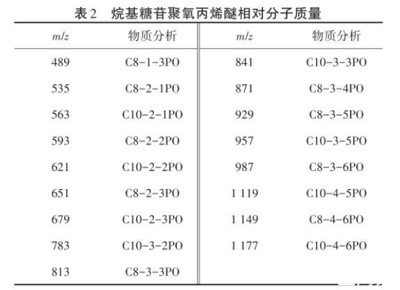 (1)以碳鏈數8/10、12/14的烷基糖苷(APG0810/APG1214)為原料,通過與環氧丙烷反應得到聚醚產物,并通過TOF質譜進行結構表征,結果表明PO基團成功引入烷基糖苷中。