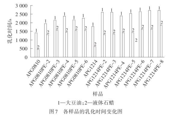 由圖7可以看出,采用乳液破乳時間表征表面活性劑的油水界面性質,APG1214和APG1214PE-m乳化大豆油以及液體石蠟的能力勝于APG0810以及APG0810PE-n,而且隨著PO加合數的增加而提高。這是由于PO基團和烷基鏈增長提供了疏水性,增強了乳化劑分子的乳化能力,延長了破乳時間。此外,所有表面活性劑乳化大豆油的能力均明顯強于乳化液體石蠟,表明PO基團可能具有類似極性作用,可以增強樣品與極性分子之間的協同作用,因此乳化性能更好。