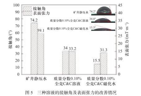 質量分數(shù)0.10%塵克C&C溶液的表面張力為33.2 mN/m.相較于礦井靜壓水,其表面張力減小了43.82%.質量分數(shù)0.10%塵克C&C磁化水的表面張力為31.3 mN/m.相較于礦井靜壓水,其接觸角減小了47.04%.由此可以看出,塵克C&C試劑和磁化相結合可更好地降低溶液的氣~液界面張力,使得溶液與低水分無煙煤顆粒接觸時,更容易排出固~氣~液三相界面的氣體,以減弱其濕潤阻力。