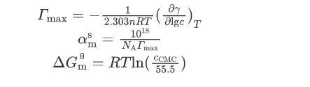 式中:γ為表面張力,mN/m;c為表面活性劑的濃度,mol/L;T為溫度,298 K;R為摩爾氣體常數(shù),8.314 J/(mol·K);n為與表面活性劑性質(zhì)相關(guān)的參數(shù),對(duì)于本文研究的非離子表面活性劑,n=1;N A為阿伏加德羅常數(shù);c CMC為臨界膠束濃度,mol/L。