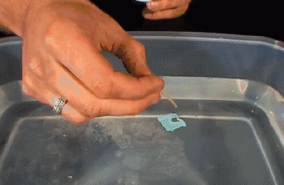 這個實驗也是很多版本,比如說我小時候看到的版本是做一個小紙船然后在尾巴的地方弄一小塊肥皂。不過這里我就想著重介紹一下下面這個超級簡單版:把固定面包袋子的那種塑料片摘下了,漂在水面上,然后在小洞的位置滴一滴洗潔精溶液,小船就動起來了。