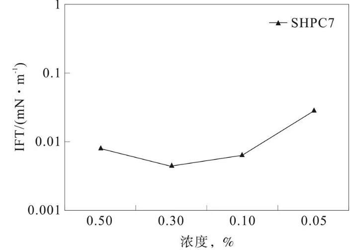 通過上述的圖可以看出,當SHPC7濃度在0.05%的時候,此時的界面張力最差,油水界面張力保持在10-2mN/m的數量級。而當濃度在0.3%的時候,此時的油水界面張力在10-3mN/m的數量級。由此可以看出,當SHPC7的濃度在0.3%的時候,其界面張力最小,滿足試驗油田樣品的驅油需求。