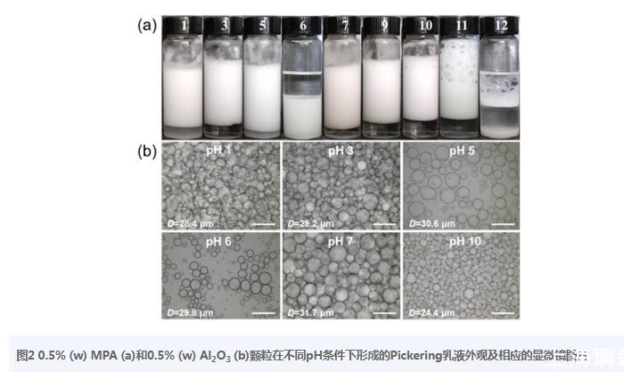 當pH=6時,親水性較強的MPA分子或Al2O3顆粒都不能形成穩(wěn)定的乳液,但兩者混合后,可以形成穩(wěn)定的W/O Pickering乳液,這可能是因為Al2O3顆粒被MPA分子經(jīng)靜電相互作用改性后疏水性增加導致的。進一步增加pH(7<pH<11),穩(wěn)定性欠佳的O/W乳液轉(zhuǎn)變?yōu)榉€(wěn)定的O/W Pickering乳液,樣品瓶底部澄清的水層可以說明,此pH區(qū)間內(nèi),MPA分子和納米Al2O3顆粒相互作用較強,Al2O3顆粒幾乎全部參與到穩(wěn)定Pickering乳液,并且乳化層上面的泡沫層越來越高,乳液液滴的粒徑也逐漸減小。然而,當水溶液為強堿時(pH=12),無法形成穩(wěn)定的乳液,這是因為部分Al2O3顆粒可以與強堿發(fā)生反應生成可水溶的偏鋁酸鈉(NaAlO2)導致的。