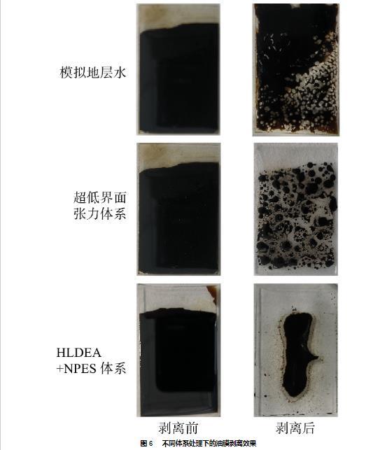 超低界面張力體系具有一定的潤濕調控性能,可以剝離44.2%的表面油膜,但其油膜剝離效率較差,剝離油膜僅在局部發揮作用,未能實現油膜的整體剝離,剝離后表面殘余油膜呈斑點狀。HLDEA+NPES體系的油膜剝離效率(75.3%)遠高于模擬地層水(24.8%)和超低界面張力體系(44.2%)。HLDEA+NPES體系中HLDEA分子作用于油固界面,改變親油表面潤濕性,有利于油膜收縮;NPES分子作用于油水界面,改變了油水界面的性質,使得油滴容易變形并脫離玻璃表面,降低了油滴的形變阻力,提高了油膜剝離率。