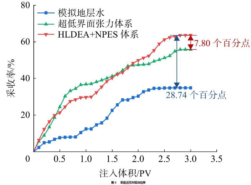 3)HLDEA+NPES體系可將原油采收率提高至63.60%,在水驅基礎上提高了28.74個百分點,在超低界面張力體系驅基礎上提高了7.80個百分點。