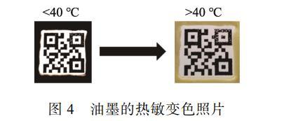 進一步探索通用油墨功能化的可能性。在通用油墨的配方中引入熱敏黑材料,以檢驗其熱變色防偽性能。如圖4所示,二維碼的黑色邊框采用熱敏黑復(fù)合通用油墨。當溫度>40℃時,中間的普通商用油墨顏色保持不變,而熱敏黑復(fù)合通用油墨邊框則逐漸變?yōu)榈S色。