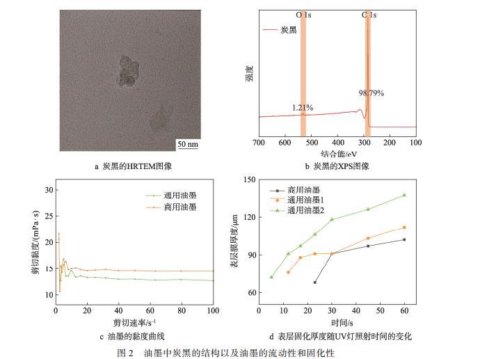 在制備油墨時,需關(guān)注黏度、分散穩(wěn)定性和固化速度,確保噴碼順利。炭黑是關(guān)鍵組分,為避免炭黑團聚導(dǎo)致穩(wěn)定性下降和打印堵塞,選擇粒徑適中的炭黑。粒徑過小易團聚,過大可能堵塞,所選炭黑粒徑在50 nm左右,HRTEM圖像如圖2a所示。對所選炭黑進行XPS分析,發(fā)現(xiàn)其氧含量高達1.2%,如圖2b所示。這一特性有望改善炭黑與油墨中極性液體的相互作用,從而進一步提升油墨的穩(wěn)定性。炭黑的良好分散性不僅有助于提高油墨的穩(wěn)定性,還有助于降低油墨的黏度。如圖2c所示,通用油墨的黏度降至13.0 mPa·s,相比商用油墨的15.5 mPa·s下降約17%,黏度的降低更有利于噴墨打印的流暢進行。
