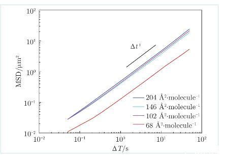 在LE相表面均勻的膜上,均方位移MSD隨時間間隔Δt線性增長(圖4),阻力系數由愛因斯坦關系