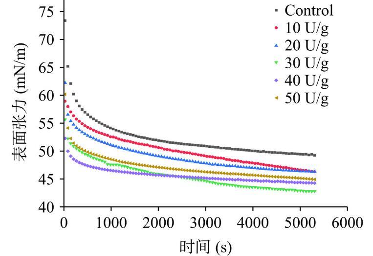 如圖1所示,蛋白質動態表面張力的下降速率總體上呈現先上升后下降的趨勢,平衡后的表面張力值呈現先下降后上升的趨勢。當加酶量達到30 U/g時蛋白質的表面張力達到了最低,這是因為適度的脫酰胺增加了蛋白質的分子柔性,結構展開暴露出來更多的疏/親水基團,更加有利于蛋白質在氣-水界面的吸附,從而使蛋白質的表面張力降低。隨著加酶量的增加,又形成了較大的聚集體,以及表面疏水性的降低也不利于蛋白質在界面上的吸附,從而導致表面張力的增加。蛋白質在氣-水界面的表面張力對其起泡性質有著很大的影響,然而表面張力與起泡性質的總體變化趨勢相似卻并不完全一致,這說明表面張力并不是決定蛋白質起泡性質的唯一因素。任中陽等發現鰱魚肌漿蛋白的起泡性與溶解度有直接關系;Johnson等研究發現蛋白質水解物聚集體的大小也會對其起泡性產生直接影響。