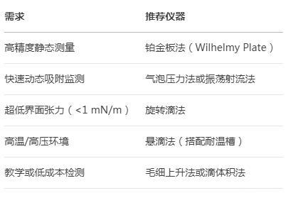 樣品性質:高粘度液體適合懸滴法或旋轉滴法,易揮發液體需密閉測量(如氣泡壓力法)。