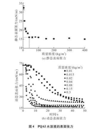 因此,本文采用芬蘭Kibron公司的表面張力儀在20一22℃下研究了溶液的界面性質,如靜態和動態表面張力。不同PQAI溶液的靜態表面張力的變化如圖4(a)所示??梢钥闯?,在去離子水中加人少量表面活性劑,溶液的表面張力急劇下降。然而,在質量濃度>0.04kg/m2時,下降趨勢開始緩慢。這意味著PQAI水溶液的pcMc~0.04kg/m2,此時表面活性劑水溶液靜態表面張力為16.07mN/m。