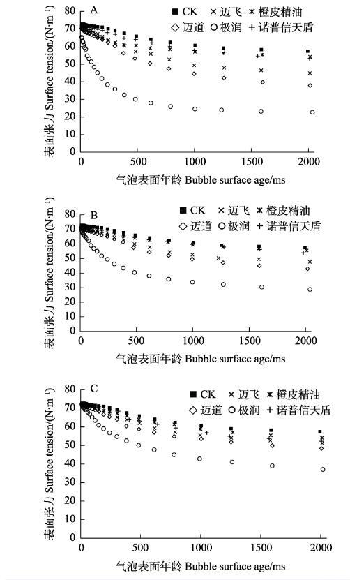 2.2不同助劑對乙基多殺菌素藥液動態(tài)表面張力的影響