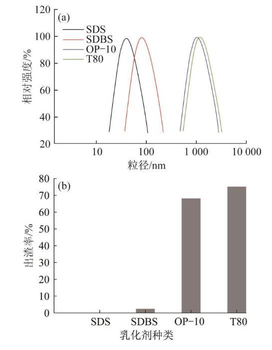 圖1乳化劑種類對(duì)產(chǎn)品粒徑中值(a)和出渣率(b)的影響