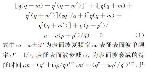 式中:α=ω±iΓ為表面波復頻率,ω表征表面波單頻率,Γ=1/τc表征表面波衰減,τc為表面波衰減的特征時間;m=(q2+iαρ/η)1/2,m′=(q2+iαρ′/η′)1/2,其中未知參數q、η、η′、ρ、ρ′分別為表面波波數、液相黏度、氣相黏度、液相密度、氣相密度;σ為表面張力。