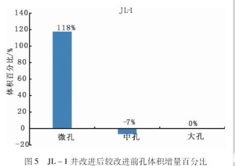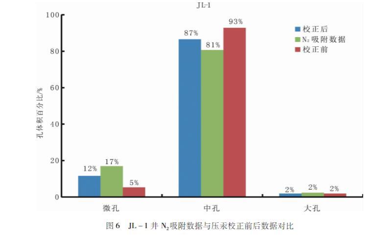 用參數校正后的方程處理數據發現樣品微孔孔體積占比增加,較原始方程處理得到的結果增加了118%;而中孔孔體積占比減小,較原始方程處理得到的結果減小了7%;大孔孔體積占比不變。用改進后的Washburn方程對松遼盆地青山口組JL-1、JL-3、SL1-9、SL1-13井的泥頁巖樣品的數據處理得出:該地區主要以微孔、中孔為主,發育有小部分大孔。統計壓汞實驗數據發現微孔占比平均12%左右,中孔占比平均為86%,大孔占比平均為2%。依據實驗數據評估,松遼盆地青山口組地區油氣主要儲集在中孔里面。因此,提高微小孔(<50 nm)烴源巖儲集層的勘探開發有十分重要的意義。