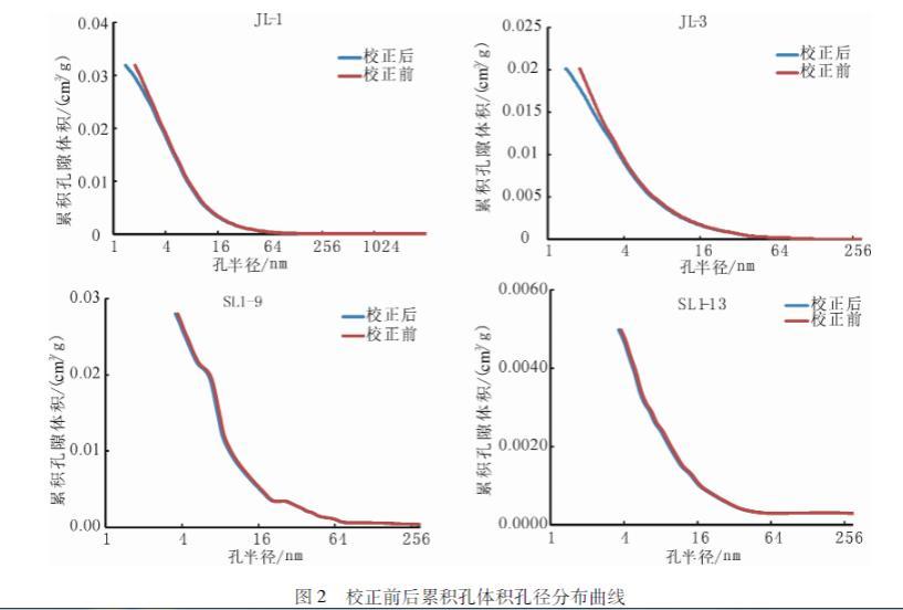 應用參數校正前后的Washburn方程對松遼盆地青山口組JL-1、JL-3、SL1-9、SL1-13井的泥頁巖樣品壓汞數據處理得到累積孔體積的孔半徑分布曲線,分析發現:參數校正后的方程對于微小孔的影響較大,在孔半徑小于4 nm時,校正前后的兩條曲線出現明顯的不重合(圖2)。