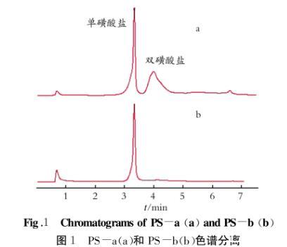 從色譜圖及色譜數(shù)據(jù)分析結(jié)果得知:PS-a和PS-b均含有單磺酸鹽和雙磺酸鹽,但兩者所含單、雙磺酸鹽的量差別較大;如果以峰面積為評價標(biāo)準(zhǔn),樣品PS-b中幾乎不含雙磺酸鹽部分,而樣品PS-a中單、雙磺酸鹽所含比例相當(dāng),約為1∶1。