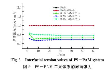 由圖5結(jié)果可知,PAM單元體系以及PAMPS-b二元體系,均不能降低原油的界面張力;為了便于在圖形中對比分析,將其界面張力設(shè)定為1.0 mN/m而PAM-PS-a二元體系可以將原油的界面張力維持在10-1數(shù)量級,數(shù)值與PS-a單元體系的界面張力數(shù)值相近,因此可以得出:無論是PS單元體系,還是PAM-PS復(fù)配體系,PS-b均不能降低原油的界面張力。