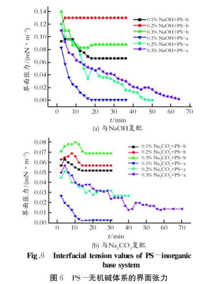 由圖6可以看出:PS-b與NaOH復(fù)配,原油的界面張力只可以降到10-2數(shù)量級,而PS-a與NaOH復(fù)配,可以將原油的界面張力降至10-4數(shù)量級;PS-b與Na2CO3復(fù)配,原油的界面張力可以降到10-2數(shù)量級;PS-a與Na2CO3復(fù)配,可以將原油的界面張力降至10-3數(shù)量級。綜上分析可以得出:PS-b的界面活性遠(yuǎn)遠(yuǎn)低于PS-a;PS-a的復(fù)配體系可以達(dá)到超低界面張力(10-3~10-4mN/m),而PS-b不能。