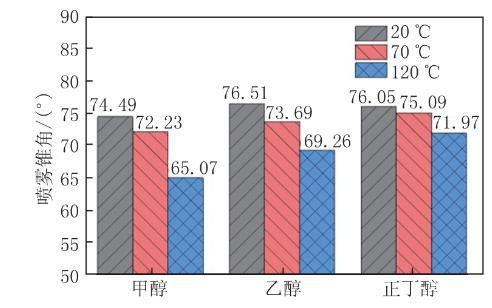 噴霧開始后1.0 ms時刻、環境溫度為20℃時,3種醇類燃料的噴霧形態無明顯差異,此時環境溫度較低,均未到達各燃料的沸點,圖像中的各路醇束較為清晰,無明顯蒸發和互相干涉現象。環境溫度升高至70℃,此時已超過甲醇的沸點,溫度的升高使燃料的動力黏度和密度減小,表面張力下降,燃料中的分子運動速度加快,分子間距增大,分子之間的作用力減小,液滴更容易破碎,使醇霧更容易產生。溫度到達120℃時,3種燃料在噴射過程中都產生了大量醇霧,各支醇束之間相互干涉、重疊,高溫環境使噴霧液滴的軸向貫穿動量降低,各燃料的整體噴霧長度略有縮短。3種燃料中,甲醇燃料的噴霧形態所發生的改變十分明顯,高溫的環境使甲醇產生大量醇霧,同時噴霧向軸線收縮,錐角減小的幅度較大。與乙醇、正丁醇相比,甲醇具有更低沸點和較高揮發性,在噴射過程中液滴受環境空氣加熱,黏度和表面張力降低,很快發生破碎并轉化為氣態,形態的轉變使液滴的動量減小,從而抑制了噴霧的擴散。