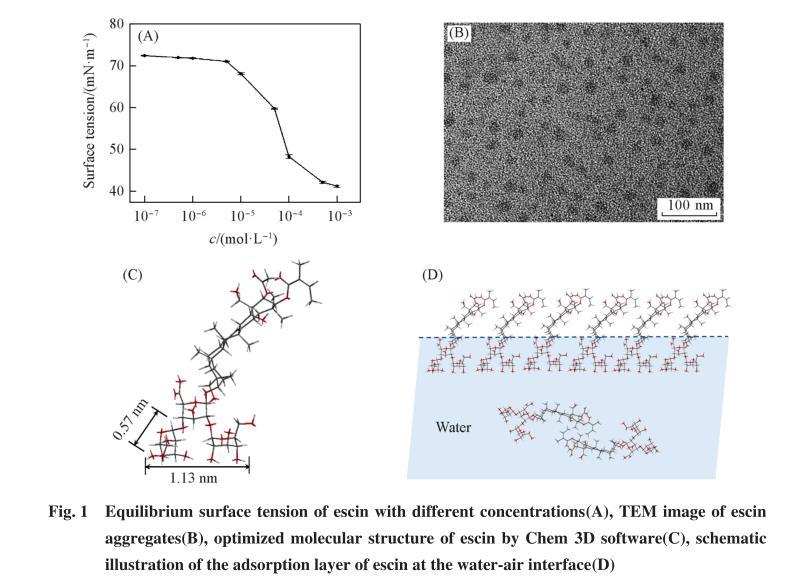 首先,采用吊片法測量了不同濃度七葉皂素溶液的表面張力.由于七葉皂素溶解度的限制,當(dāng)濃度超過1×10-3mol/L時會有少量固體物質(zhì)析出,影響測試結(jié)果,故表面活性測試的濃度范圍為1×10-7~1×10-3mol/L.如圖1(A)所示,隨著七葉皂素濃度的增加,表面張力呈現(xiàn)先基本不變、后快速下降、最后達(dá)到平衡的3個階段.這是由于濃度低于1×10-5mol/L時,只有少量七葉皂素分子吸附在氣-液界面,表面張力基本不變;然后隨著濃度增加,越來越多的分子遷移并吸附在氣-液界面,使溶液表面張力快速下降;當(dāng)分子在界面吸附達(dá)到飽和(5×10-4mol/L)后,開始在體相聚集形成膠束,表面張力不再改變.可知,七葉皂素的臨界膠束濃度(cmc)為5×10-4mol/L,對應(yīng)的表面張力(γcmc)為42.1 mN/m.圖1(B)為七葉皂素形成聚集體的TEM照片,膠束大小約為20 nm.
