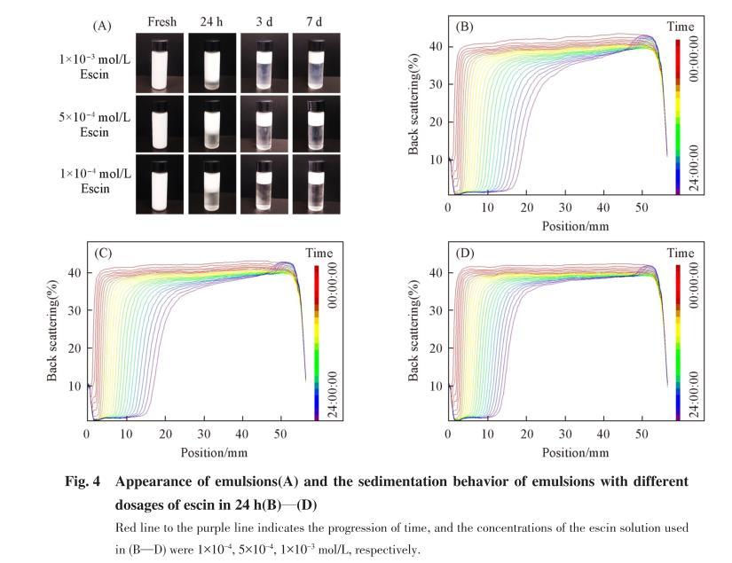可見,七葉皂素濃度為1×10-4和5×10-4mol/L時,在24 h內(nèi)分層較明顯,前者的分層程度略大于后者,當(dāng)濃度為1×10-3mol/L時,分層得到明顯抑制,較為穩(wěn)定,該現(xiàn)象與貯存穩(wěn)定性表征結(jié)果一致[圖4(A)].這是由于兩親性的七葉皂素分子結(jié)構(gòu)具有較多的含氧基團(羥基和羧基),在油-水界面層具有強分子間作用(氫鍵),高濃度形成的界面膜的收縮彈性強于低濃度,在油-水界面發(fā)生形變時,界面膜產(chǎn)生相應(yīng)形變而非解吸附,因此高濃度七葉皂素所形成的乳液穩(wěn)定性相對更好.