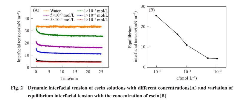 使用視頻光學(xué)接觸角測量儀,利用懸滴法測定溶劑油150#和不同濃度七葉皂素溶液的油-水界面張力.溶液為內(nèi)相,溶劑油150#為外相.將七葉皂素溶液置于氣密性良好的注射器(針管外徑為1.65 mm)中,利用步進(jìn)馬達(dá)將溶液(8μL)注射到裝有溶劑油150#的玻璃皿中,CCD攝像機同步記錄測定過程的液滴狀態(tài)(每次測定25 min),軟件通過液滴形狀分析計算出界面張力.分別測定超純水以及不同濃度七葉皂素溶液與溶劑油150#的界面張力,每個樣品重復(fù)測3次.