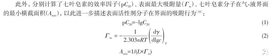 此外,分別計算了七葉皂素的效率因子(pC20)、表面最大吸附量(Γm)、七葉皂素分子在氣-液界面的最小橫截面積(Amin),以此進(jìn)一步描述表面活性劑分子在界面的吸附行為: