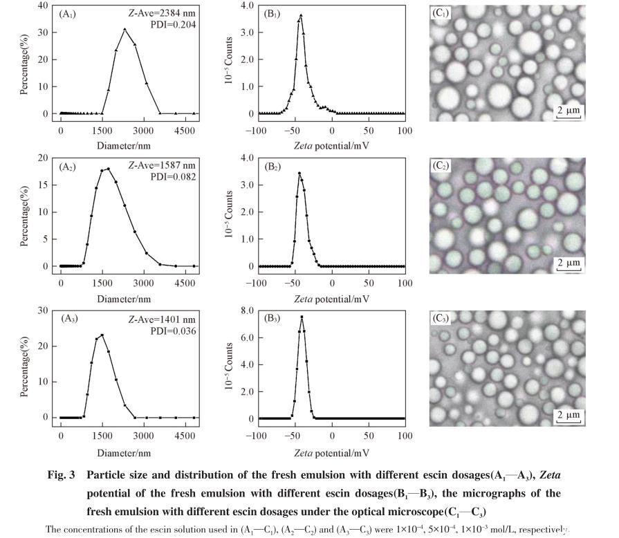 首先使用激光粒度儀表征了新制乳液的粒徑大小及分布情況,如圖3(A1)~(A3)所示.隨著七葉皂素濃度從1×10-4mol/L增大到1×10-3mol/L,乳液平均粒徑Z-Ave從約2.4μm下降至1.4μm,單分散系數(shù)(PDI)逐漸降低,粒徑分布范圍逐漸變窄,表明乳液穩(wěn)定性得以提高.光學(xué)顯微鏡表征結(jié)果[圖3(C1)~(C3)]也印證了該結(jié)論.