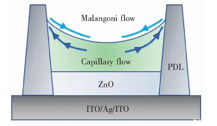 量子點的成膜形貌與墨水配方密切相關。與平面上成膜容易產生咖啡環類似,在像素結構中量子點容易形成邊緣堆積的薄膜形貌。為了使量子點從邊緣遷移到像素坑中心,需要增大液滴內部自外而內的馬蘭戈尼流。