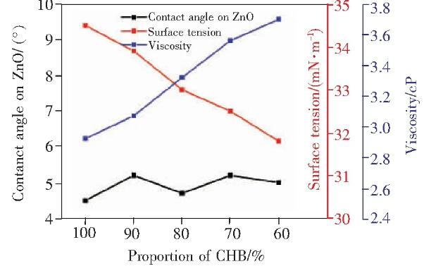 圖1不同比例墨水的表面張力、粘度和在ZnO上的接觸角。