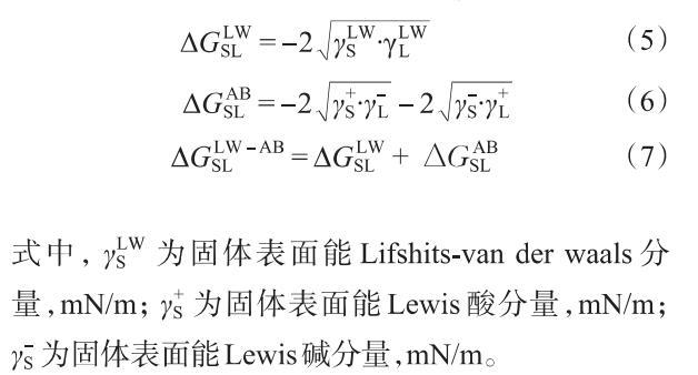 根據DLVO擴展理論,首先分別通過式(5)和式(6)計算LW相互作用自由能(和AB相互作用自由能()。然后,通過式(7)計算去離子水溶液中的液-固界面作用能()。