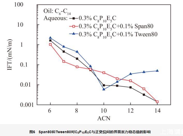 從圖中可以看出,由于Span80是油溶性很強(qiáng)的非離子表面活性劑,其在水中溶解性不好,只能與C8P10E5C分子形成混合膠束。因此,Span80不會(huì)影響C8P10E5C的親水親油平衡,表現(xiàn)為混合體系的nmin值與單獨(dú)C8P10E5C相似。同時(shí),Span80會(huì)分配到油相中,然后從油相一側(cè)向界面吸附。這就造成油相烷烴碳數(shù)較低、界面張力較高時(shí),Span80通過混合吸附,輕度降低界面張力;而當(dāng)油相烷烴碳數(shù)較高、界面張力較低時(shí),Span80通過競(jìng)爭(zhēng)吸附,造成界面張力略有升高。但總體而言,油溶性非離子表面活性劑對(duì)界面張力影響不大。