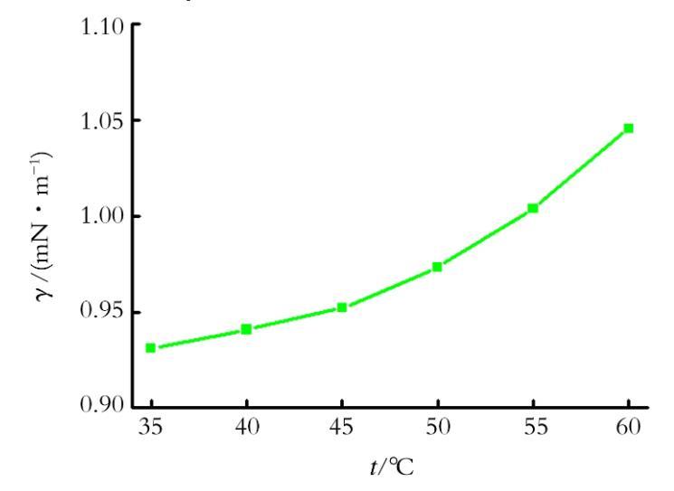 圖3為CPFE質(zhì)量濃度為40 mg/L時,不同溫度下大慶采油三廠原油體系的油-水界面張力。