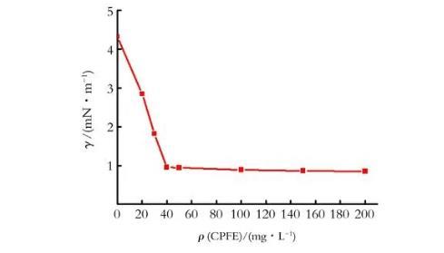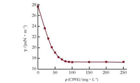 25℃條件下,CPFE水溶液的表面張力與質(zhì)量濃度的關(guān)系曲線如圖1所示。