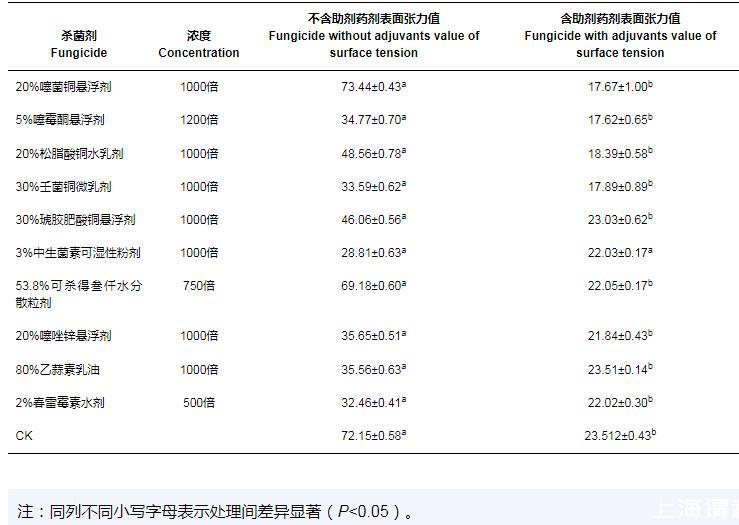 研究表明,在加入0.1 g/L助劑380前后,田間推薦劑量的20%噻菌銅懸浮劑、20%松脂酸銅水乳劑和20%松脂酸銅水乳劑等9種殺菌劑的表面張力值均降低,并且存在顯著性差異。其中,1000倍的20%噻菌銅懸浮劑表面張力值為(73.44±0.43)mN/m,加入助劑后的表面張力值為(17.67±1.00)mN/m,降低率可達74.94%。3%中生菌素可濕性粉劑的表面張力值在加入助劑前后無顯著性差異(圖3,表2)。