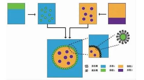 越復雜的功能需求往往越需要復雜的結構體系來支撐。相較于單腔室乳液,多腔室乳液無論是在功能性成分的包封方面,還是在輸送及釋放方面都存在十分明顯的優勢,且許多研究表明多腔室乳液的穩定性可以得到保證,這無疑為食品行業發展提供了新的方向,可以通過制備更具結構復雜性的內外多腔室等級乳液來滿足市場上愈加多樣化的需求。乳液的制備通常需要3個步驟:第1步制備出O1/W1型乳液液滴,第2步是制備W2/O2型乳液,最后是以O1/W1乳液液滴為穩定劑制備得到具有內外多腔室和等級結構的多重乳液((O1/W1)/O2/W2),如圖所示。乳液的穩定性主要是靠制備乳液液滴的乳化劑在油-水界面的自組裝作用、油相添加量、乳液液滴濃度等幾種因素之間的相互作用來決定的。