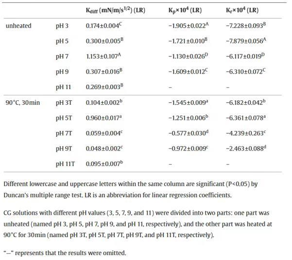 Kdiff、Kp和Kr的最高值分別為pH值7、3和5。柔性蛋白可以在油水界面上更快地吸附和重新排列。pH為3時CG靈活的二級結(jié)構(gòu),使其具有更好的吸附動力學(xué),。pH 5(接近pI 4.3)的CG更弱的靜電斥力,引起了更好的結(jié)構(gòu)重排。加熱后,除pH值為5時CG的Kdiff外,所有樣品的Kdiff、Kp和Kr均有所下降。加熱后的CG具有較低的初始界面張力和較短的平衡吸附時間(圖1a),它能迅速達到平衡狀態(tài),并且吸附動力學(xué)指數(shù)較低。此外,加熱后的CG表現(xiàn)出顯著的變性和聚集,殘留的蛋白質(zhì)分子會產(chǎn)生空間位阻,從而阻礙聚集后的CG到達油水界面。此外,不溶性CG聚集體對殘留CG分子的吸附產(chǎn)生了屏障。CG在pH為5時,蛋白質(zhì)形成大量沉淀,溶解度僅為12.05%。可溶性蛋白含量低意味著較弱的靜電排斥力,這使剩余的蛋白更容易擴散,從而導(dǎo)致最高的Kdiff。與動態(tài)界面張力相比,CG與pH 5T的吸附動力學(xué)不受蛋白質(zhì)濃度的影響。